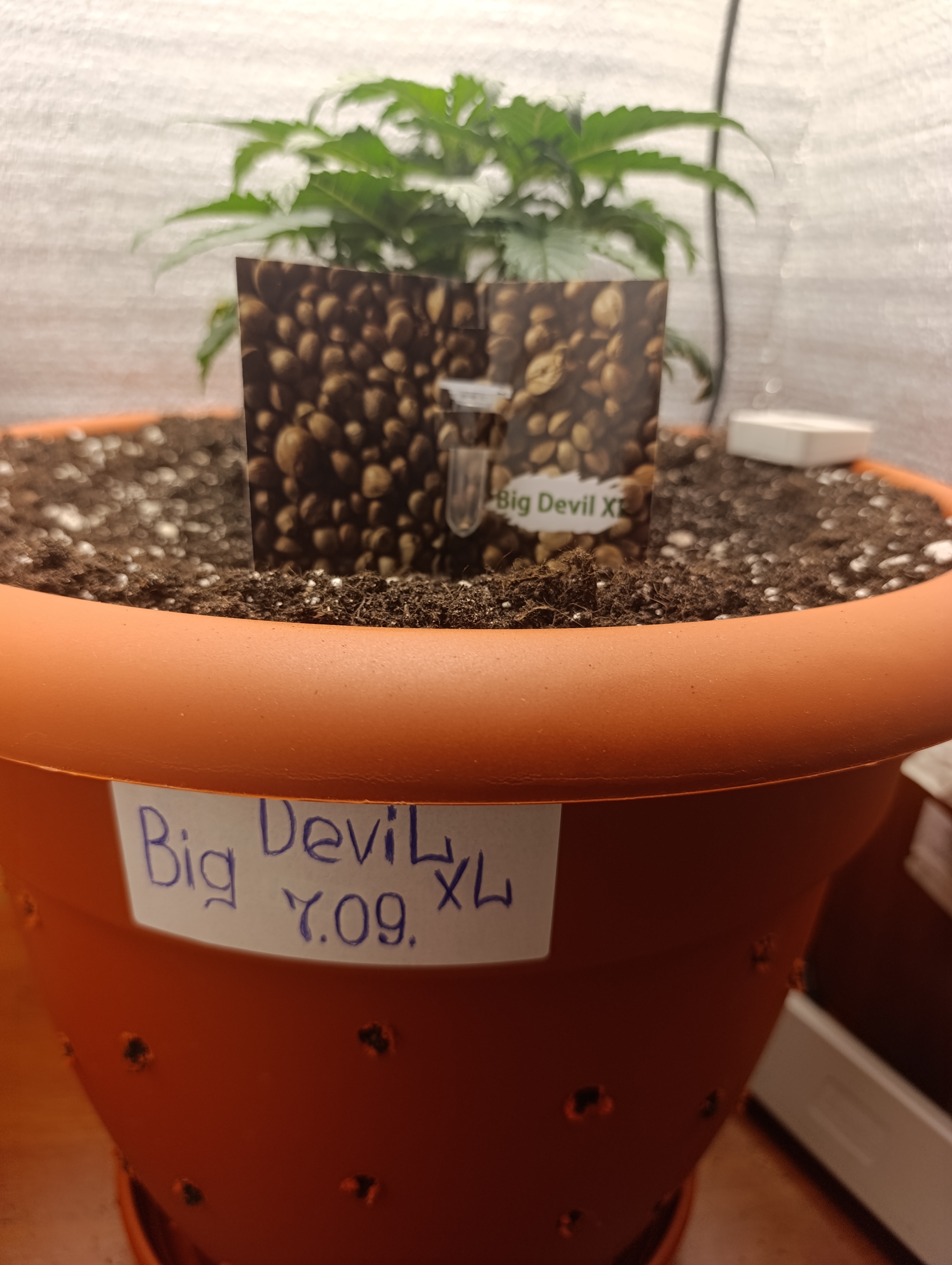 Приветствую всех кто в теме! Ребята очень достойный сорт берите и не сомневайтесь. Очень бодро растёт, на начальной стадии! Сейчас посадил в 37 л горшок! Чтобы получить больше выхлопа! Big devil неприхотлив, не требует много внимания, просто полив немного удобрений и всё будет шикарно! Сейчас ему 3 недели, первый бабок вырос 1.8 м! В горшке 12 л. Удобрение трипарт. Главное не борщить с удобрениями! Всем доволен, рекомендую магазин!